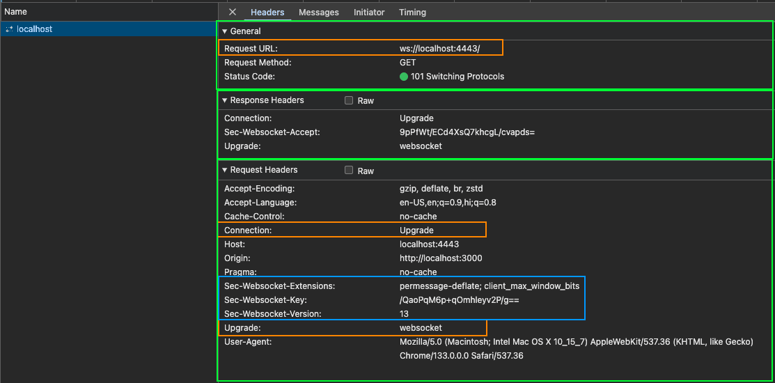 - Upgrade: websocket and Connection: Upgrade headers signal the intent to switch protocols.